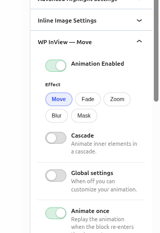 You can also set global default values for each animation type in the WP InView admin panel (WordPress menu > WP InView). Blocks without their own settings automatically inherit these global values.